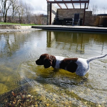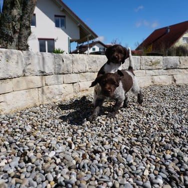 Bei den milden Temperaturen lieben es die Welpen, wenn sie draußen auf dem ganzen Grundstück toben können. Auch das Wasser wird erkunden und sie lieben es!